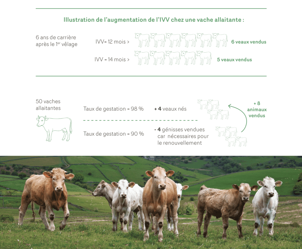 Alors que l’IVV mesure la productivité des vaches gestantes, le taux de gestation et la productivité globale, mesurent l’efficacité de la reproduction de manière plus générale pour l’exploitation.