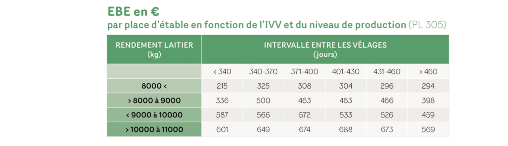 En dessous de 10 000 kg de lait par vache sur les 305 premiers jours de lactation, l’IVV doit être inférieur à 400 jours pour optimiser la rentabilité. Au-delà de 10 000 kg, il peut s’allonger quelque peu.
