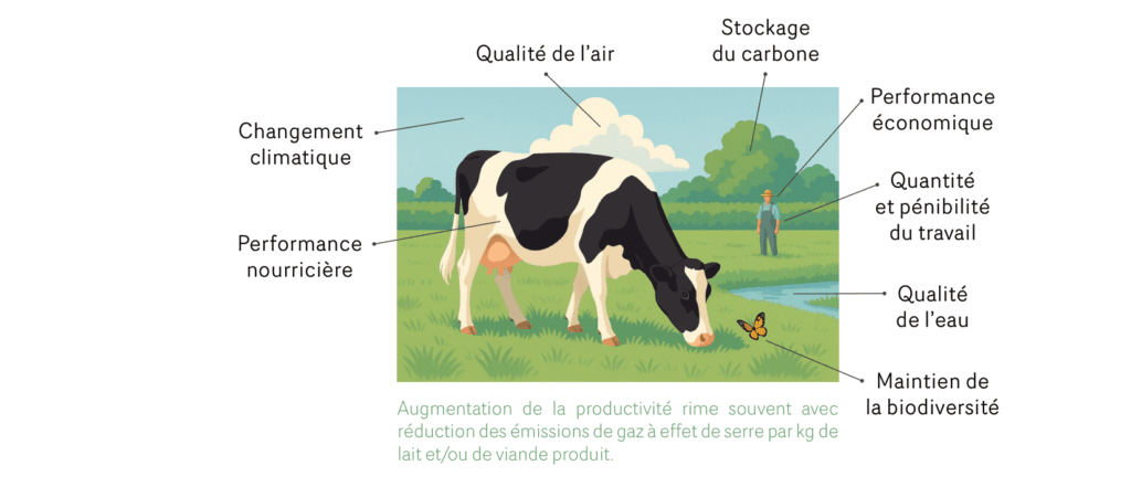une réduction du nombre d’animaux nécessaires pour la même production. L’amélioration technique, sur des critères tels que la mortalité, l’IVV, la consommation d’intrants est l’une des possibilités de réduction des impacts de l’élevage.